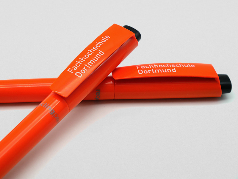 Der neue nachhaltige FH-Kugelschreiber in Hausfarbe mit FH-Logo-Aufdruck. Innen und außen nachhaltig –besteht er aus 100 % rABS (recycelter ABS-Kunststoff), die Herstellung erfolgt mit 100 % Ökostrom. Die Silktechmine wird aus rPP (recyceltes Polypropylen) gefertigt und hat eine bleifreie Minenspitze aus Edelstahl mit eingelassener 1,0 mm Wolfram-Karbid Kugel. Die Minen werden „on demand“ hergestellt, was so viel bedeutet, dass sie „frisch“ hergestellt werden. Die schreiben und schreiben und schreiben. Natürlich enthalten sie auch keine gefährlichen Stoffe nach SVHC.