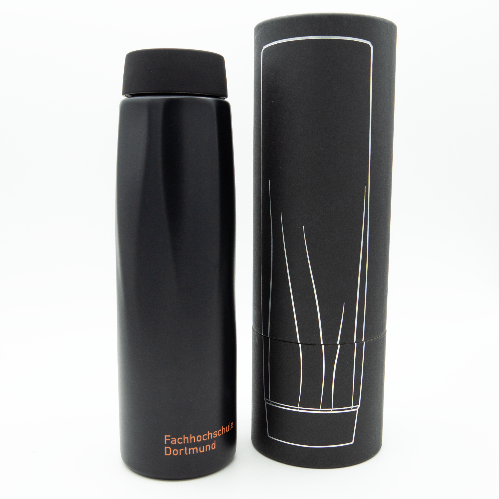 "Some like it cold and some like it hot! Unsere elegante neue Trinkflasche aus recyceltem, medizinischem Edelstahl (2x wall vacuum recycled SS 304 out 0,5mm/in 0,4 mm) hält Getränke bis zu 12 Stunden warm und bis zu 24 Stunden kalt. Sie ist die perfekte umweltbewusste Alternative zu Plastikflaschen, da Edelstahl aufgrund seiner Recyclingfähigkeit ein äußerst nachhaltiges Material ist. Dazu hat sie ein edles Design - schwarz mit einem schwarzen Deckel in Softtouch.
